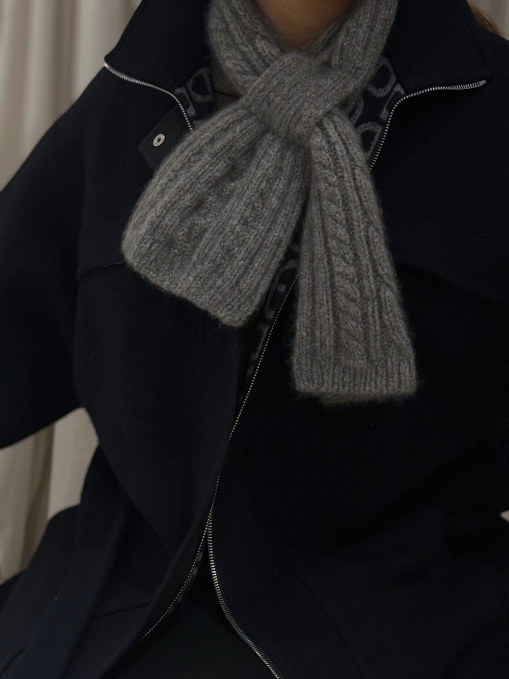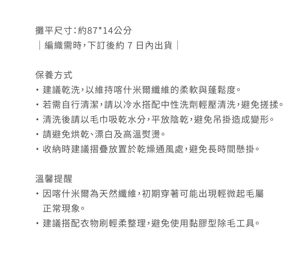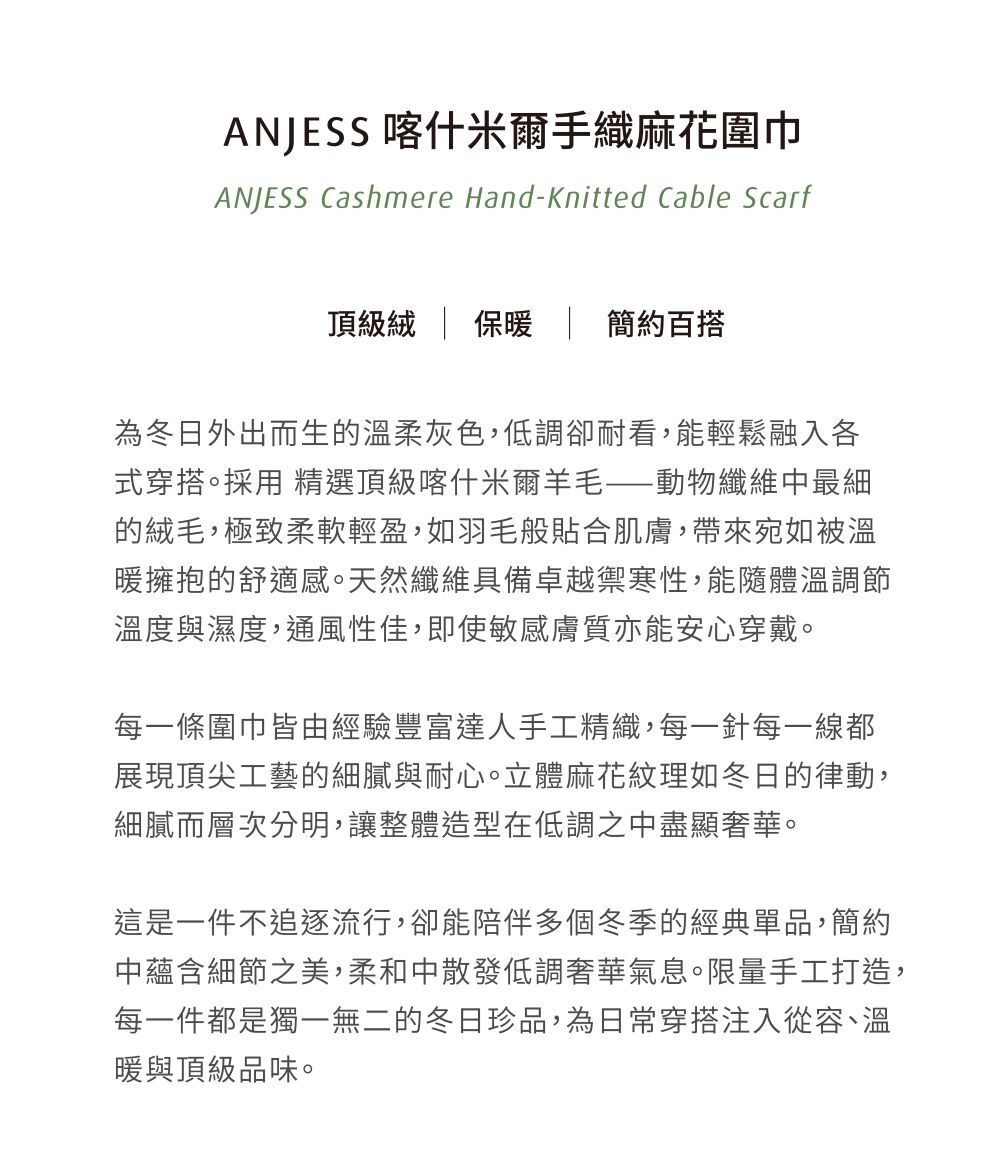為冬日外出而生的溫柔灰色,低調卻耐看,能輕鬆融入各式穿搭。採用 精選頂級喀什米爾羊毛——動物纖維中最細的絨毛,極致柔軟輕盈,如羽毛般貼合肌膚,帶來宛如被溫暖擁抱的舒適感。天然纖維具備卓越禦寒性,能隨體溫調節溫度與濕度,通風性佳,即使敏感膚質亦能安心穿戴。