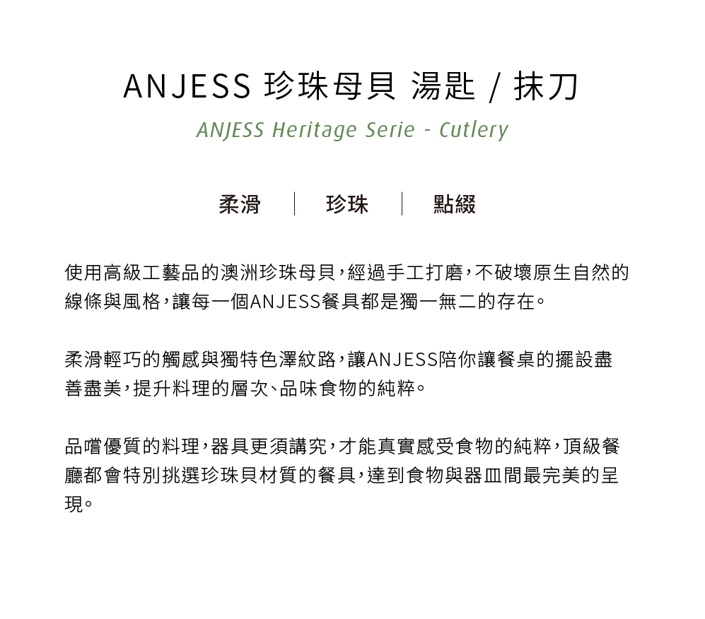 使用高級工藝品的澳洲珍珠母貝,經過手工打磨,不破壞原生自然的線條與風格,,讓每一個ANJESS餐具都是獨一無二的存在。