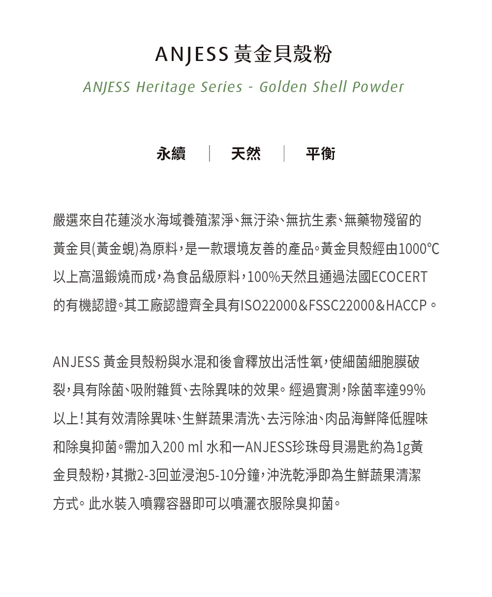 ANJESS環保黃金貝殼粉有效清除異味、生鮮蔬果清洗、去污除油、肉品海鮮降低腥味和除臭抑菌。