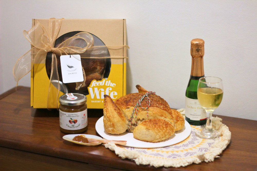 特別與台北手工烘焙品牌 「胖死我太太」 聯名打造主角——火雞造型酸種麵包。以天然食材慢發酵,外型溫暖可愛,麵香帶微微酸香,是象徵團聚與分享的節日氛圍。