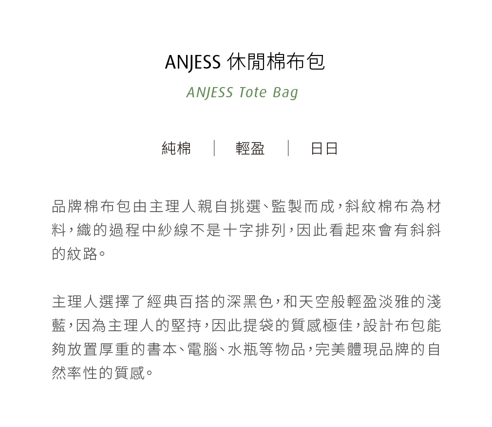 兩款帆布袋由主理人親自設計,以100%棉質,斜紋棉布為材料,簡約的設計和俐落的剪裁,是由主理人監製而成。選擇經典百搭的深黑色,以及天空般輕盈淡雅的淺藍,提袋的質感絲毫沒有馬虎,想讓擁有它的人,輕易愛上它,並在頻繁的日常裡也能輕鬆搭配,讓ANJESS將質感帶入你的生活。