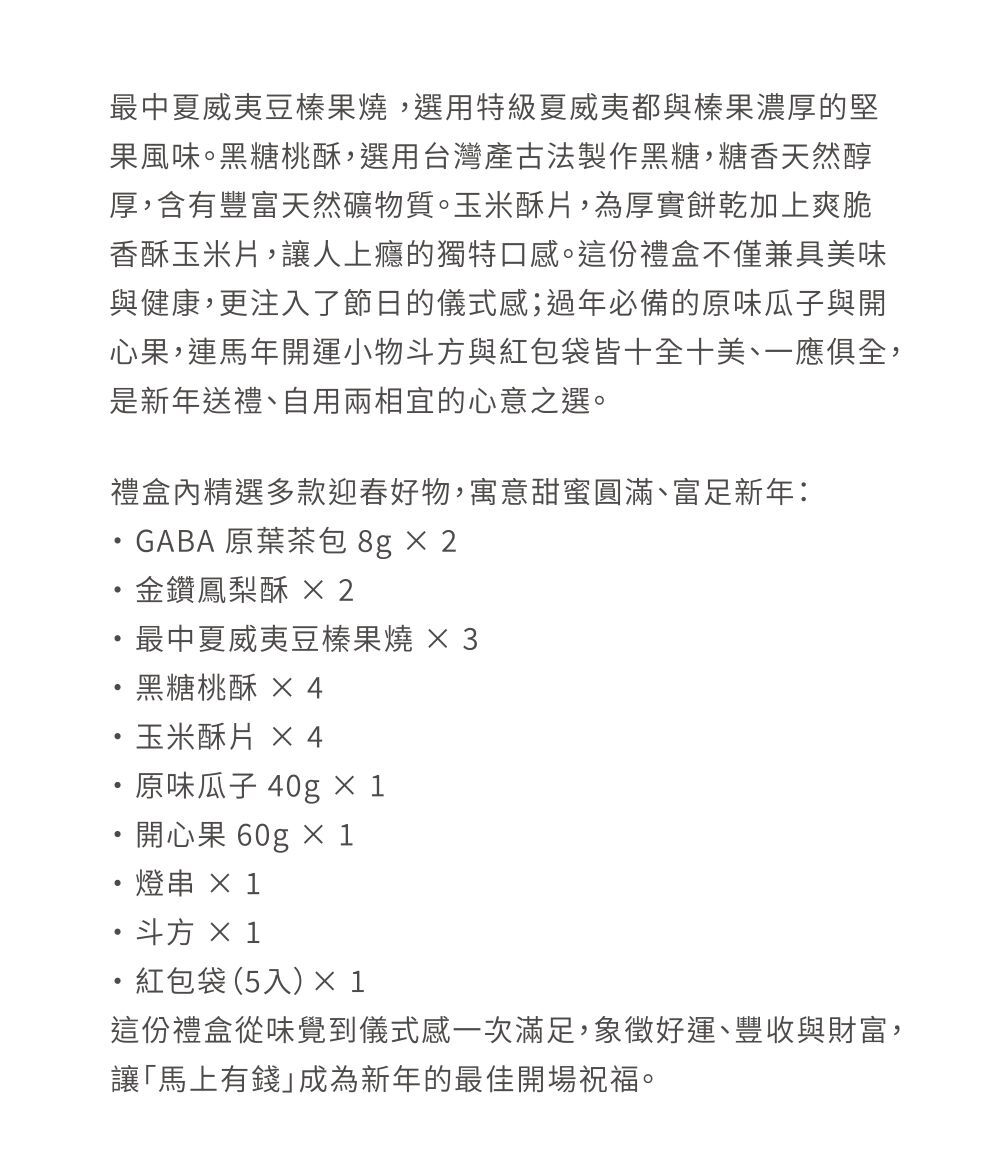 「馬上有錢」新年禮盒,精選低咖啡因的GABA佳葉龍茶、講究口感的金鑽鳳梨酥、最中夏威夷豆榛果燒、黑糖桃酥、玉米脆片、香脆瓜子與開心果一次到位。搭配喜氣滿載的馬年開運斗方與紅包袋,燈籠禮盒讓整個新年至元宵都喜氣連連!無論企業送禮或親友拜年,都讓新年的第一份心意就贏在氣勢與好兆頭。