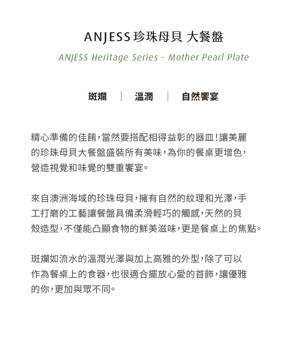 精心準備的佳餚,當然要搭配相得益彰的器皿!讓美麗的珍珠母貝大餐盤盛裝所有美味,為你的餐桌更增色,營造視覺和味覺的雙重饗宴。