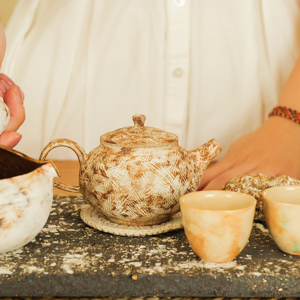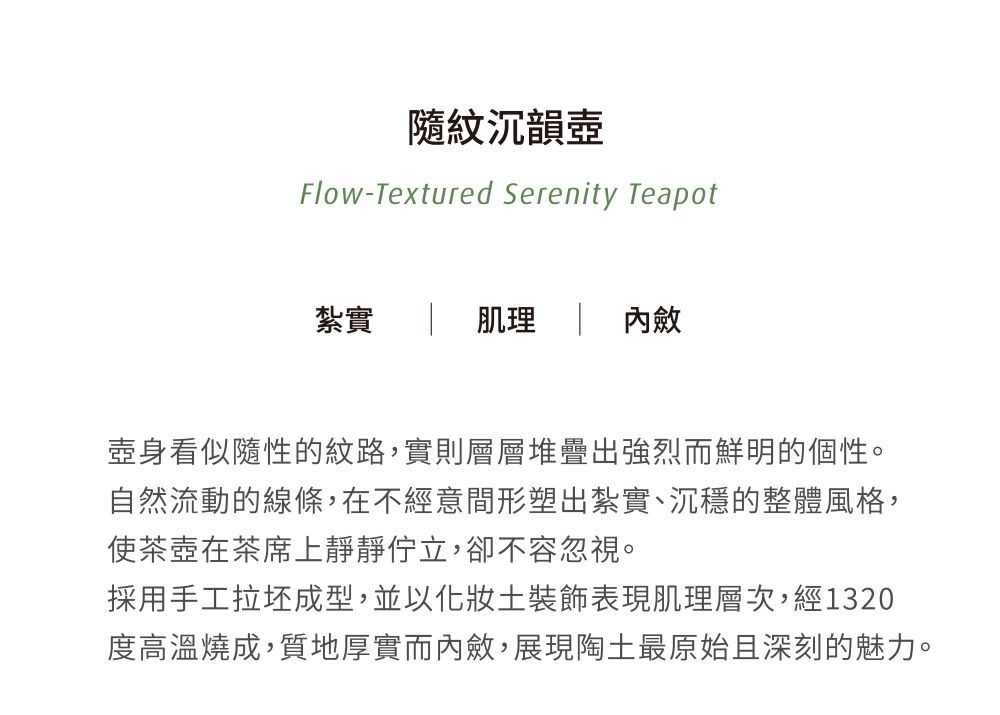 壺身看似隨性的紋路,實則層層堆疊出強烈而鮮明的個性。自然流動的線條,在不經意間形塑出紮實、沉穩的整體風格,使茶壺在茶席上靜靜佇立,卻不容忽視。