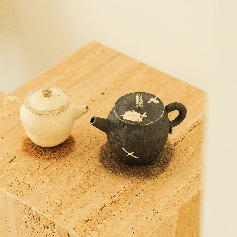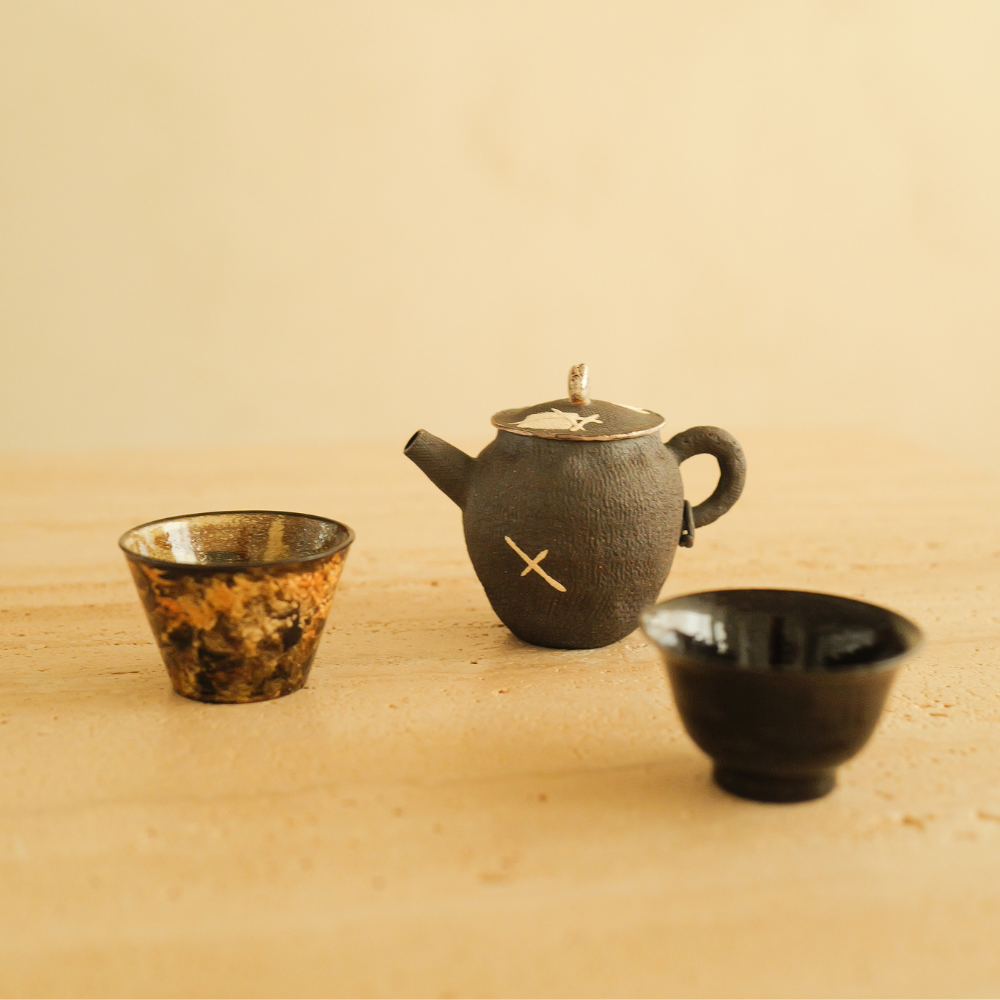 杯蓋小提把鑲以銀色細節,如畫龍點睛般點亮整體視覺,與壺身質地彼此呼應。杯蓋與壺身在比例與紋理上取得恰到好處的平衡。經 1320°C 高溫燒成,使胎土與表面質地緊密融合,呈現穩定而深沉、耐人細品的手作質感。