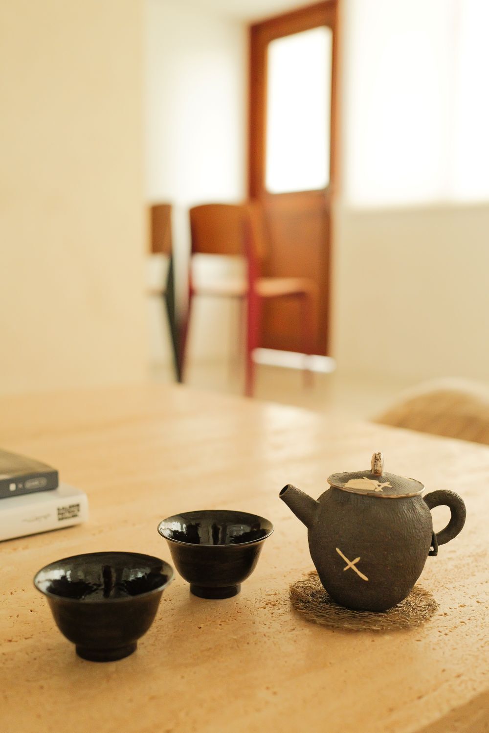 不容忽視的手捏壺。灰黑色壺身沉穩內斂,在茶席間靜靜佇立,卻自有存在感。全器以手捏成型,結合隨性而自然的刻劃線條與綜合裝飾語彙,為器物增添幾分趣味與流動感,紋理在光影下忽深忽淺,展現手作獨有的節奏。