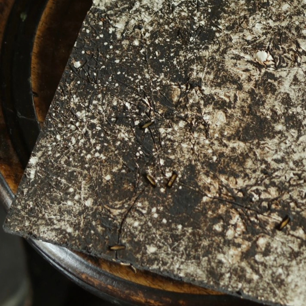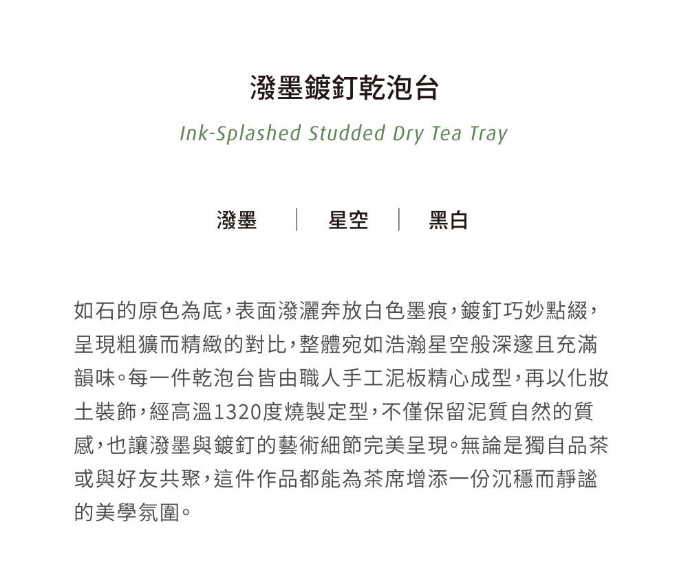 如石的原色為底,表面潑灑奔放白色墨痕,鍍釘巧妙點綴,呈現粗獷而精緻的對比,整體宛如浩瀚星空般深邃且充滿韻味。每一件乾泡台皆由職人手工泥板精心成型,再以化妝土裝飾,經高溫1320度燒製定型,不僅保留泥質自然的質感,也讓潑墨與鍍釘的藝術細節完美呈現。
