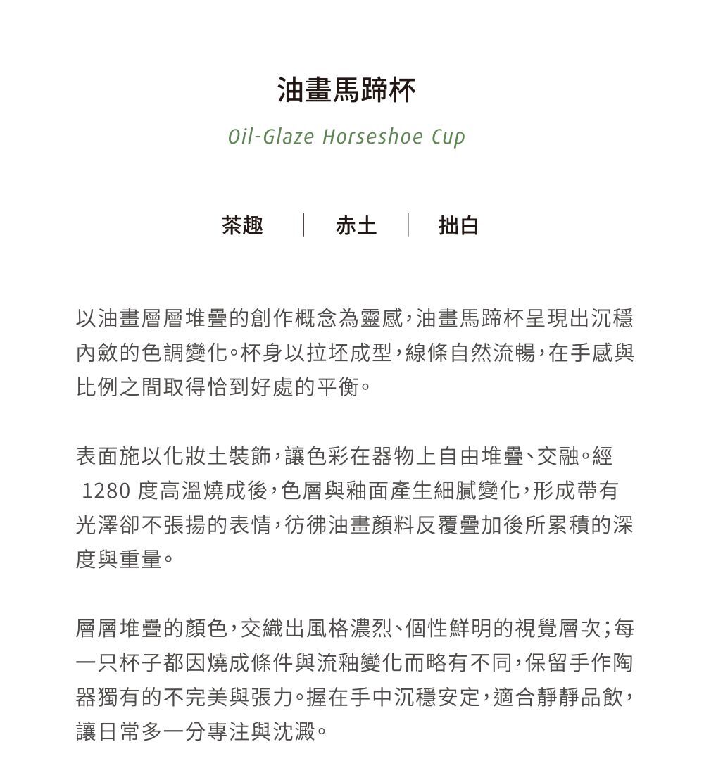 以油畫層層堆疊的創作概念為靈感,油畫馬蹄杯呈現出沉穩內斂的色調變化。杯身以拉坯成型,線條自然流暢,在手感與比例之間取得恰到好處的平衡。