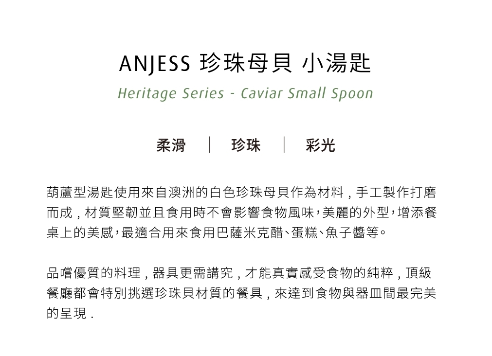 葫蘆型湯匙使用來自澳洲的白色珍珠母貝作為材料 , 手工製作打磨而成 , 材質堅韌並且食用時不會影響食物風味,美麗的外型,增添餐桌上的美感,最適合用來食用巴薩米克醋、蛋糕、魚子醬等。