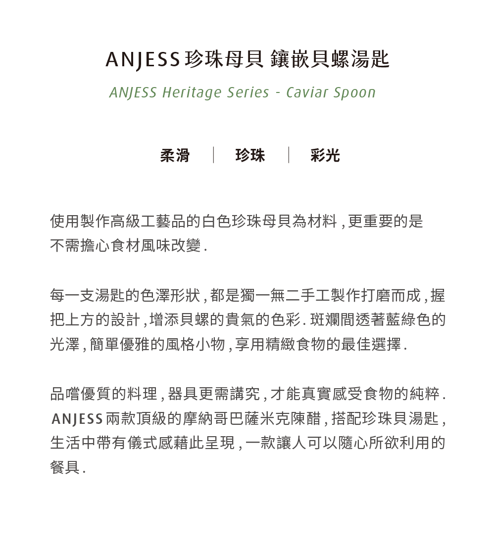 搭配 ANJESS 兩款頂級的摩德納巴薩米克陳醋再適合不過 , 使用來自澳洲的珍珠母貝為材料 , 獨一無二手工製作打磨而成 , 更重要的是不需擔心食材風味改變 .