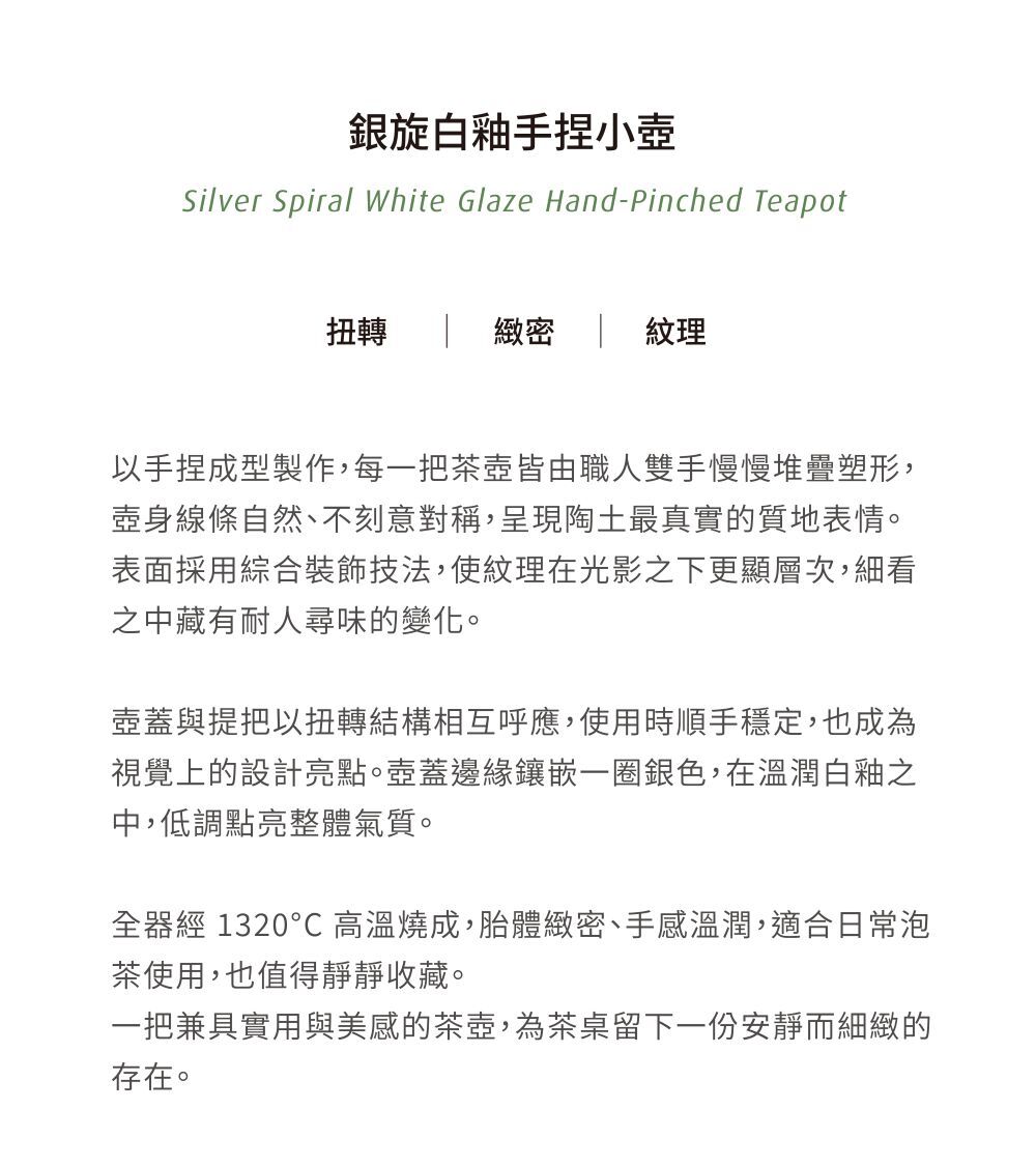 壺蓋與提把以扭轉結構相互呼應,使用時順手穩定,也成為視覺上的設計亮點。壺蓋邊緣鑲嵌一圈銀色,在溫潤白釉之中,低調點亮整體氣質。