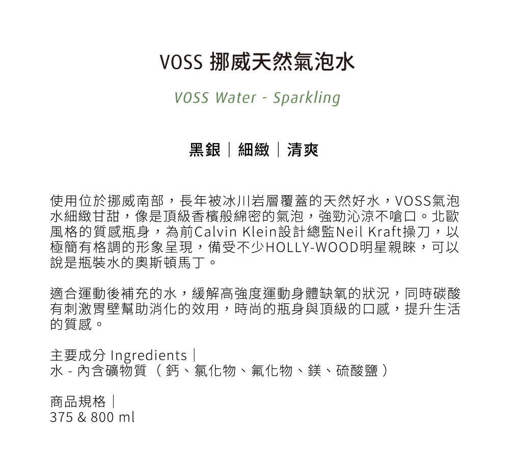 適合運動後補充的水,緩解高強度運動身體缺氧的狀況,同時碳酸有刺激胃壁幫助消化的效用,時尚的瓶身與頂級的口感,提升生活的質感。
