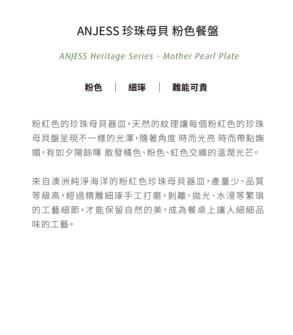 來自澳洲純淨海洋的粉紅色珍珠母貝器皿,產量少、品質等級高,經過精雕細琢手工打磨,剝離、拋光、水浸等繁瑣的工藝細節,才能保留自然的美,成為餐桌上 讓人細細品味的工藝。